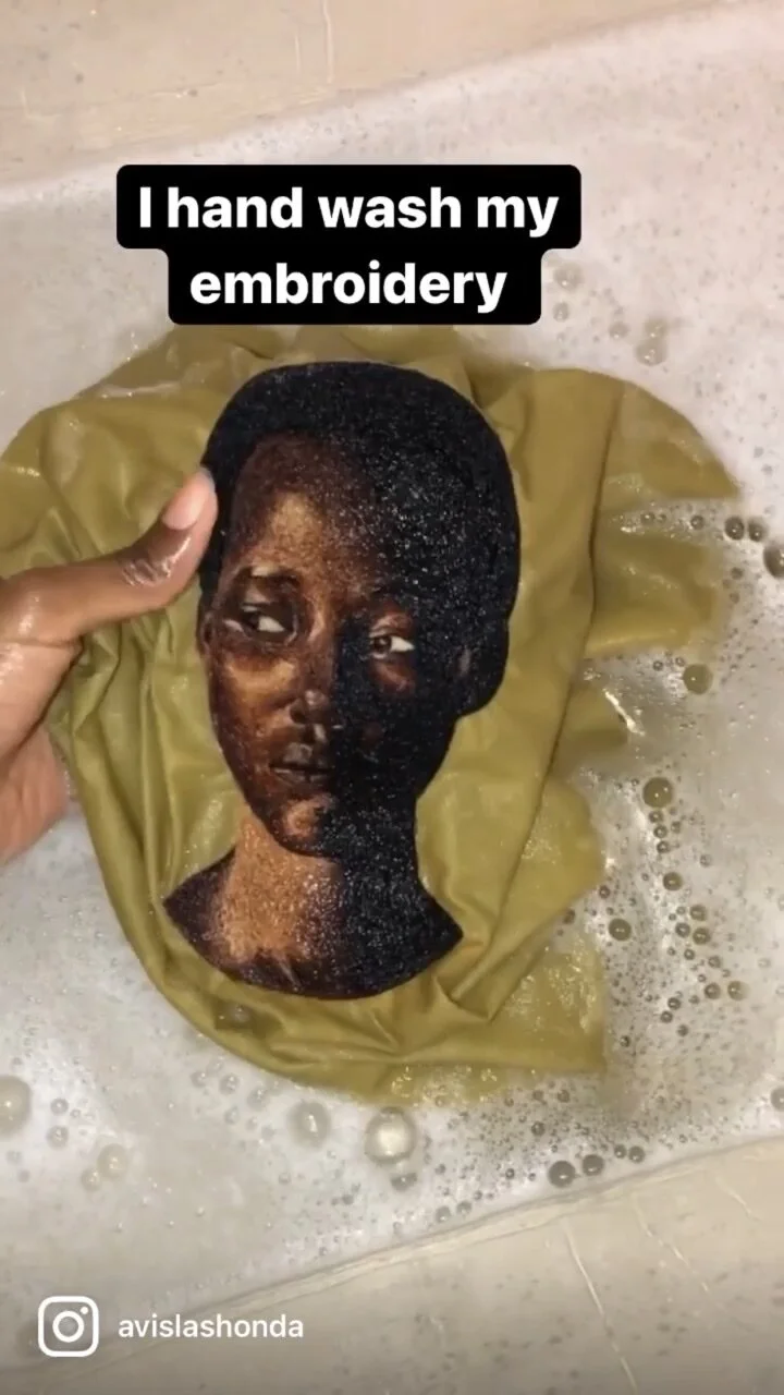 I hand wash all of my embroideries to remove all oils that were transferred from my hands on to the piece while holding the piece for 8 months. Also, washing the piece will shrink the cotton of the threads and fabric which in return will tighten the piece. You want to remove the oils from the piece to ensure that your fingerprints don’t appear on the piece over time.